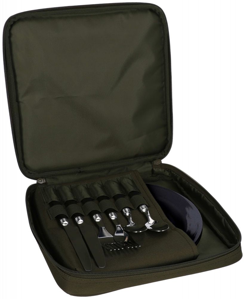 Základný jedálenský set pre dve osoby. Sada obsahuje dva taniere, príbory (dva nože, dve vidličky, dve lyžice) a dobre vyzerajúce puzdro. Vynikajúca voľba pre akýkoľvek rybársky výlet.