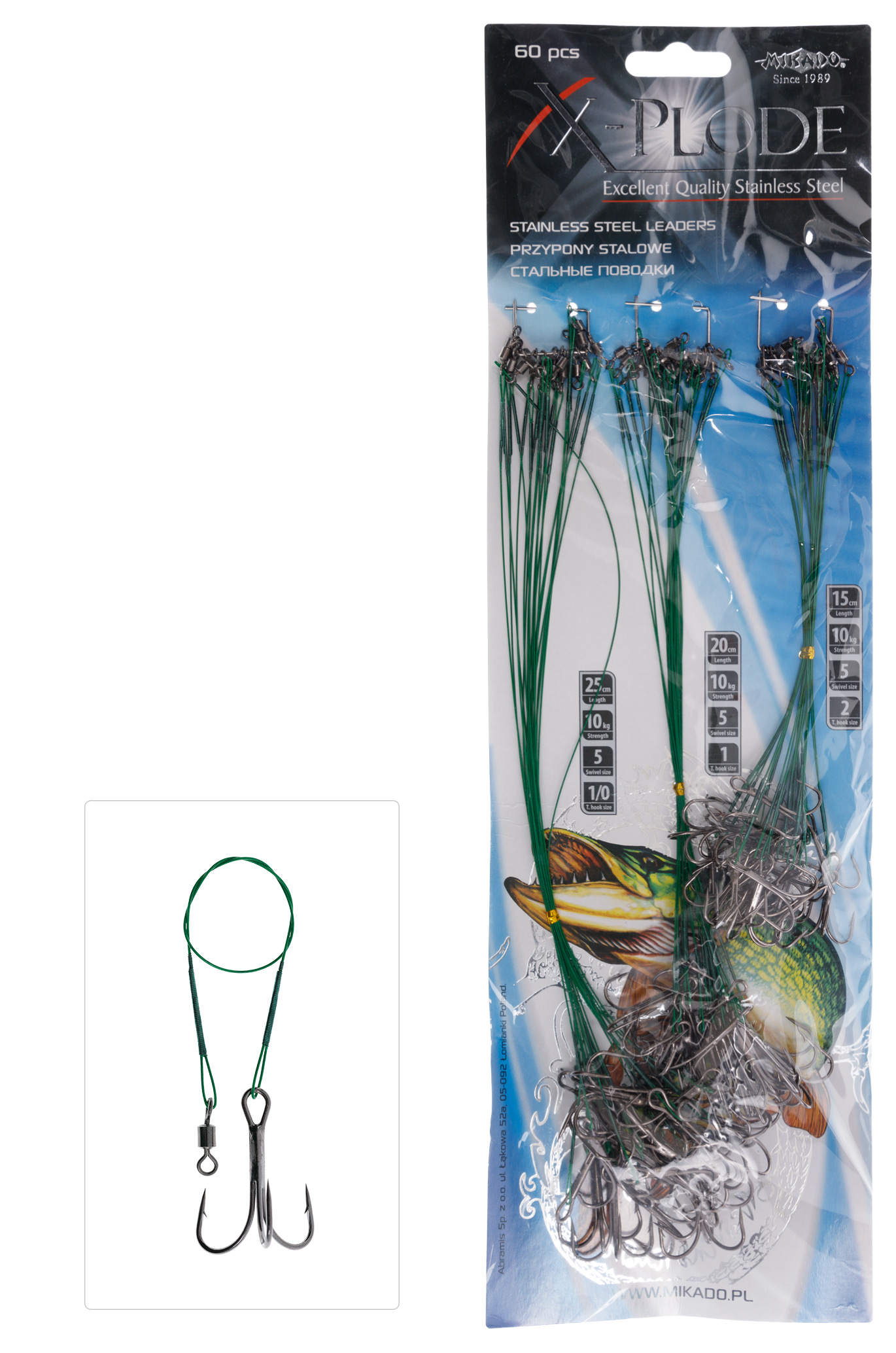 MIKADO Tabuľa oceľových laniek s obratlíkom a trojhákom X-PLODE (15/20/25cm,10kg,trojhák 1,2,1/0,Zelené) 60ks