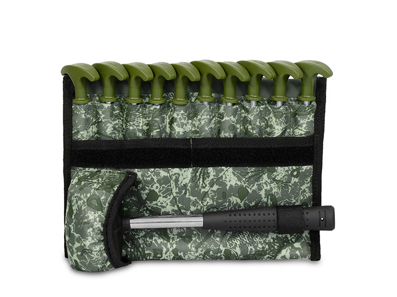 Set obsahujúci 10 pevných, kovových kolíkov s kladivom v praktickom puzdre s C2G dizajnom.